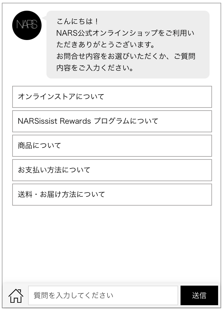 「NARS Cosmetics オンラインサイト」 サポートチャットボット設置ページ