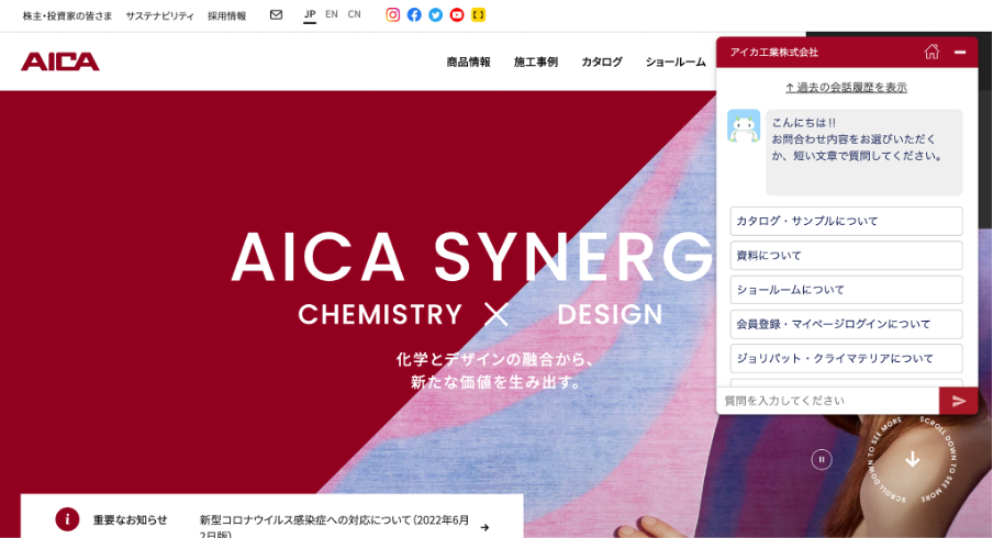 アイカ工業は、愛知県名古屋市に本社を置く、メラミン化粧板国内シェア1位の建材メーカーです。アイカ工業では、以前からチャットボットを導入していたものの、利用率が低いことや、お客様の疑問を解決できているかを確認しづらいことが課題になっていました。
