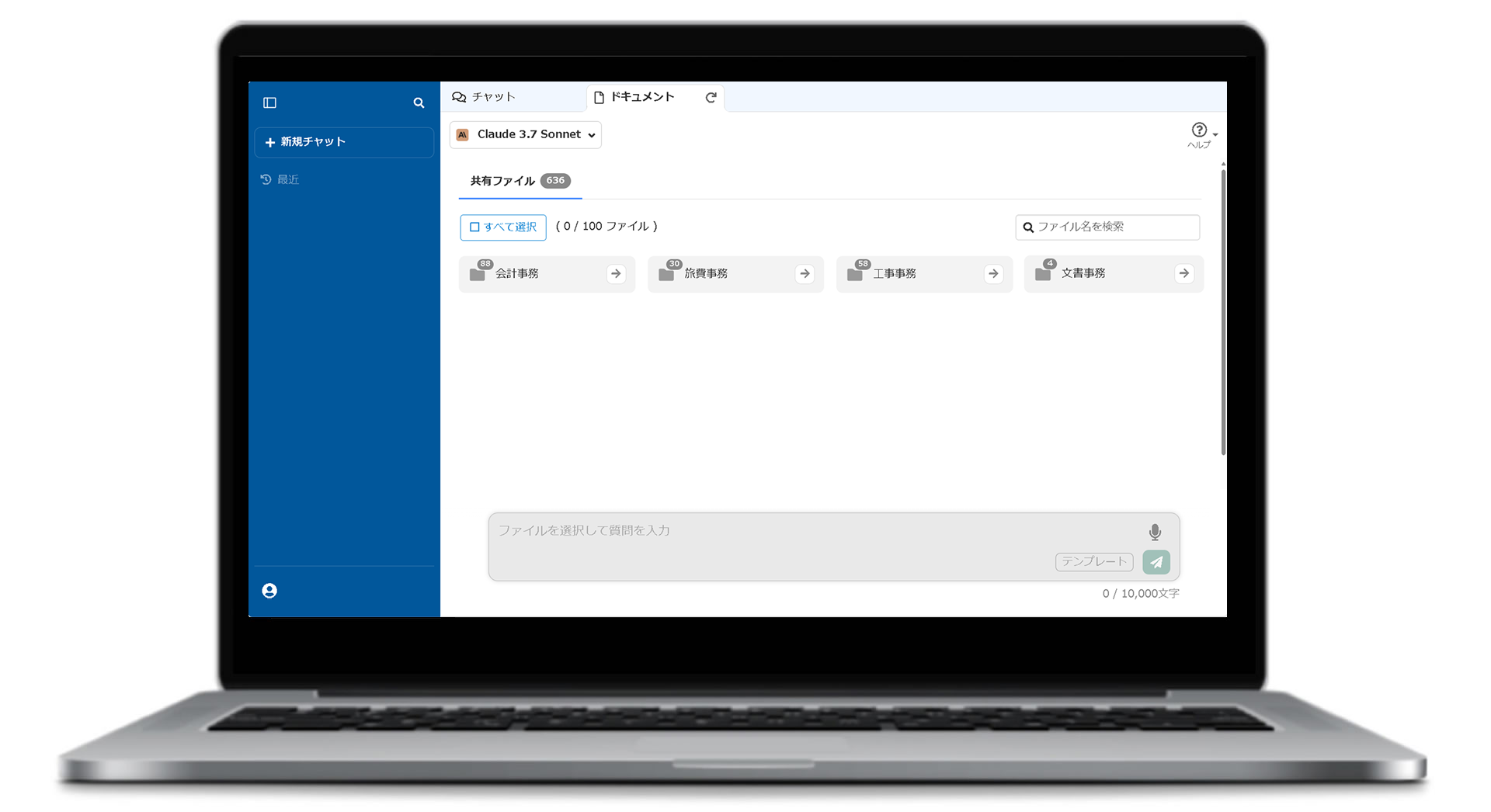 そこで、本サービスでは、社員が利用したデータがAIの学習には利用されない安全な環境で生成AIを利用でき、また社内ファイルをアップロードすることで、自社データと生成AIを連携してより実務的な利用を可能にしております。