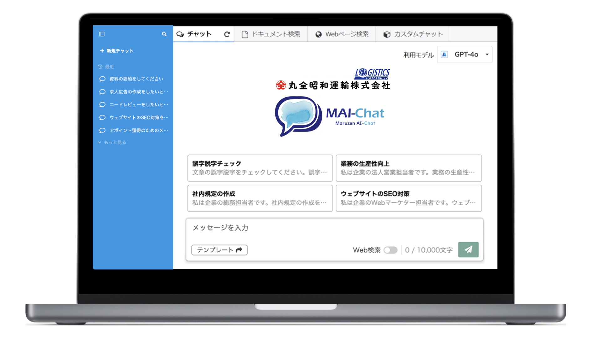 陸・海・空すべての輸送手段を駆使し、国内外で最適なロジスティクスを提案する総合物流企業である丸全昭和運輸では、全社的なDX推進の一環として生成AIの活用を検討していました。そこで、社員が利用したデータがAIの学習には利用されない安全な環境で生成AIを利用でき、かつ用途に応じて複数の生成AIモデルを切り替えられること、RAG(Retrieval Augmented Generation、検索拡張生成)によって社内データを横断的に検索・活用できる点を評価し、「ユーザーローカル ChatAI」の導入を決定しました。