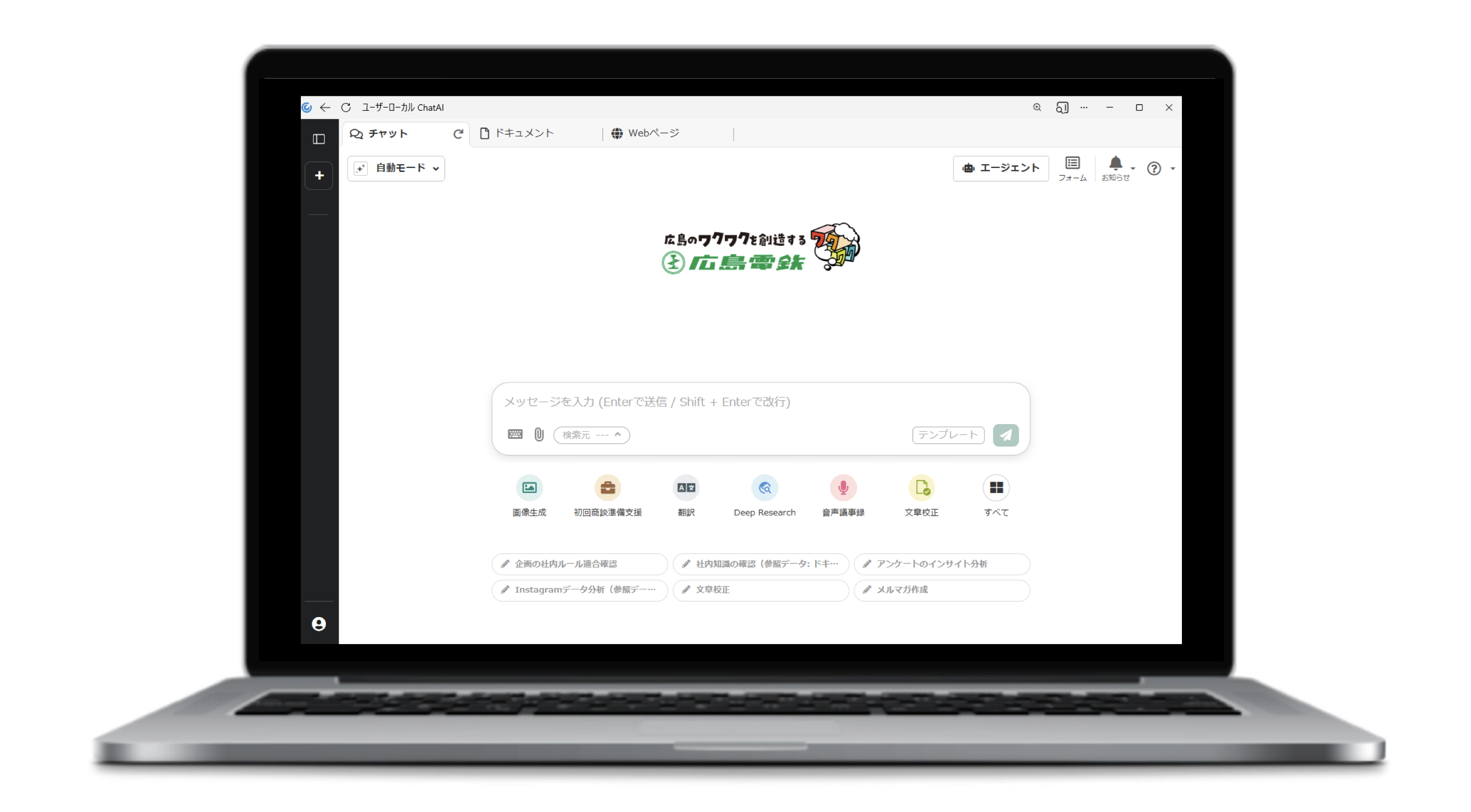 株式会社ユーザーローカル(東京都港区、代表取締役社長:伊藤 将雄)は、広島電鉄株式会社(広島県広島市、代表取締役社長:仮井 康裕、以下、広島電鉄)に、自社内でChatGPTやGemini、Claudeなどの生成AIを利用できる「ユーザーローカル ChatAI」(写真1)を提供開始したことを発表します。